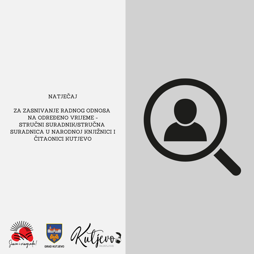U nastavku potrebne informacije za Oglas za prijam na radno mjesto: Stručni suradnik u Narodnoj knjižnici i čitaonici Kutjevo.