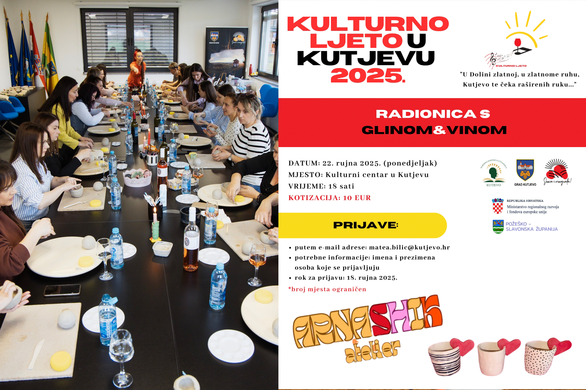 Pozivamo vas na radionicu s glinom i vinom koja će se održati 22. rujna 2025. (ponedjeljak) u Kulturnom centru u Kutjevu, s početkom u 18 sati.
